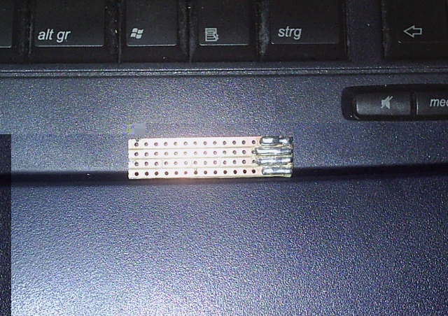 Habs grad auch mal probeiert, allerdings habe ich einen kleinen Verbesserungsvorschlag. Bei mir sind die Lochrasterstreifen etwas zu breit, sodass die "Datenstreifen" schon an die Spannungsversorgung kommen könnten. Daher habe ich die Mittleren beiden Streifen weggenommen.