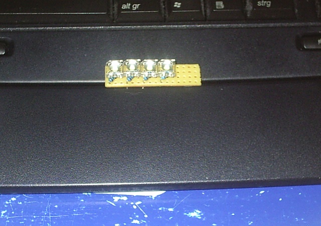 So zurück zum eigendlich Thema man könnte für seinen Pc auch eine Art USB-Port stöpselbastel, eine Platine die nur minimal länger ist als der usbport tief und dann an der vorderkannte 4smd leds. Je nach Pc kann man dann rote/blaue/grüne/... Farbene Usbstöpsel einsetzen. Sieht zumindest nett aus, wenn auch nicht immer praktisch.