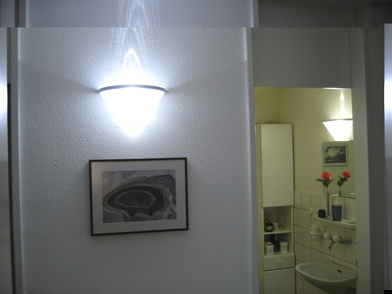 ich habe meine wohnung konsequent (1 ausnahme) auf led umgestellt. angefangen mit der feststellung dass sich die ware im kühlschrank direkt unter der lampe in wenigen sek. um 10°C erwärmt. die 15 watt wurden durch umgebaute 1,5 watt multiledlampe ersetzt (bild1).dann folgte, nach den nachttischlampen mit derselben ausrüstung, das bad mit 3x seoul p4 und2x cree (bild2). dann mit erscheinen der acriche folgten eingang, durchgang, wc und schlafzimmer(bild3) mit je 2x doppelchip weiss oder 2xweiss und 1x warmweiss. zwischendurch war der wohnraum an der reihe. hier wurden die spots von halogen auf LED-SPOT mit luxeon umgewechselt (entäuschend!) dann, 2 wochen bevor sie im shop erschienen habe ich die luxeonchips durch cree ersetzt und mit dem erscheinen der acriche 3watt habe ich versuchsweise einen spot mit diesem chip ausgerüstet (beste leuchtkraft). nachdem küche und arbeitszimmer noch je 5x acriche 3watt erhalten haben (bild4) bin ich von ursprünglich 850 watt glühbirnen über zum glück nur teilweise augeführte theoretische 350 watt quecksilberhaltigen sondermüll (die auch vom WWF empfohlenen sparlampen) bin ich heute bei 125 watt led licht gelandet. dabei war mir wichtig dass ich's jetzt heller habe als vorher