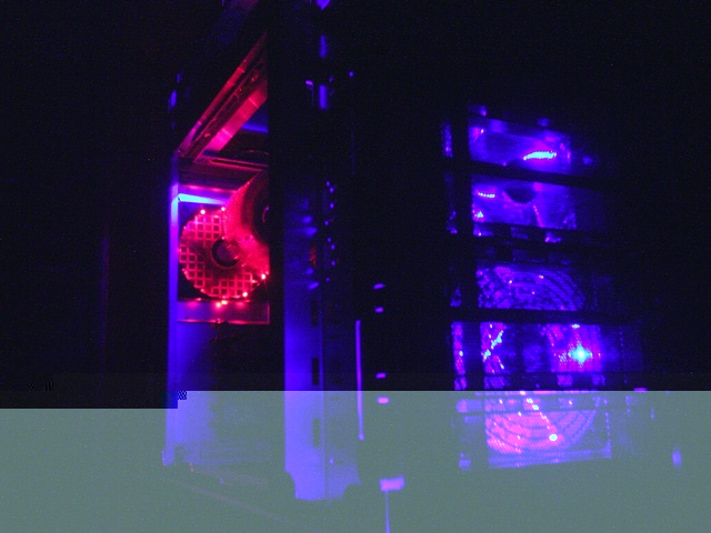 Hier nochmal die Linke seite des gehäuses mit dem gut zu sehenden Roten Led Lüfter und das darunter liegende Rote Led Cluster und bei den laufwerksschächten unten die Blauen Led's und oben wieder der Farbmix aus zwei Roten und einer Blauen LED.
