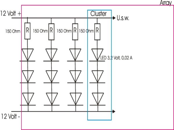You have recht! Zunächst, das geregelte Netzteil: von Lumitronix (Ca. 4 Euro) Werte (12.35 Volt Lehrlauf)(800mA max). Konstantstromquelle ist in Konstruktion (REgelbar von 1,2 - 32V, 1 Amp. max bei Conrad ca 8 Euro). Schaltung der Cluster 3 LED Serie (3,2Volt 18mA)plus 1 R 150 ebenfalls in Serie. = ...