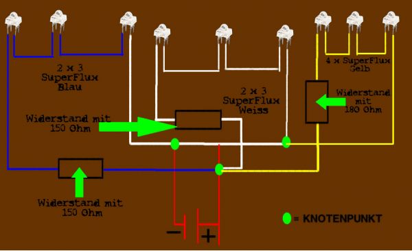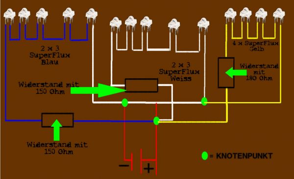 Warum malst Du so schöne Bildchen von der Verschaltung der LED´s und baust dann die Schaltung anders auf? In deinem Schaltbild sind vier gelbe Superflux mit einem 180 Ohm Widerstand in Reihe. Hatte ich ja Anfang - so wie in der Zeichnung ( 3x blau , 3x weiss ubd 4 gelbe) Erst nachdem mir die gelben...
