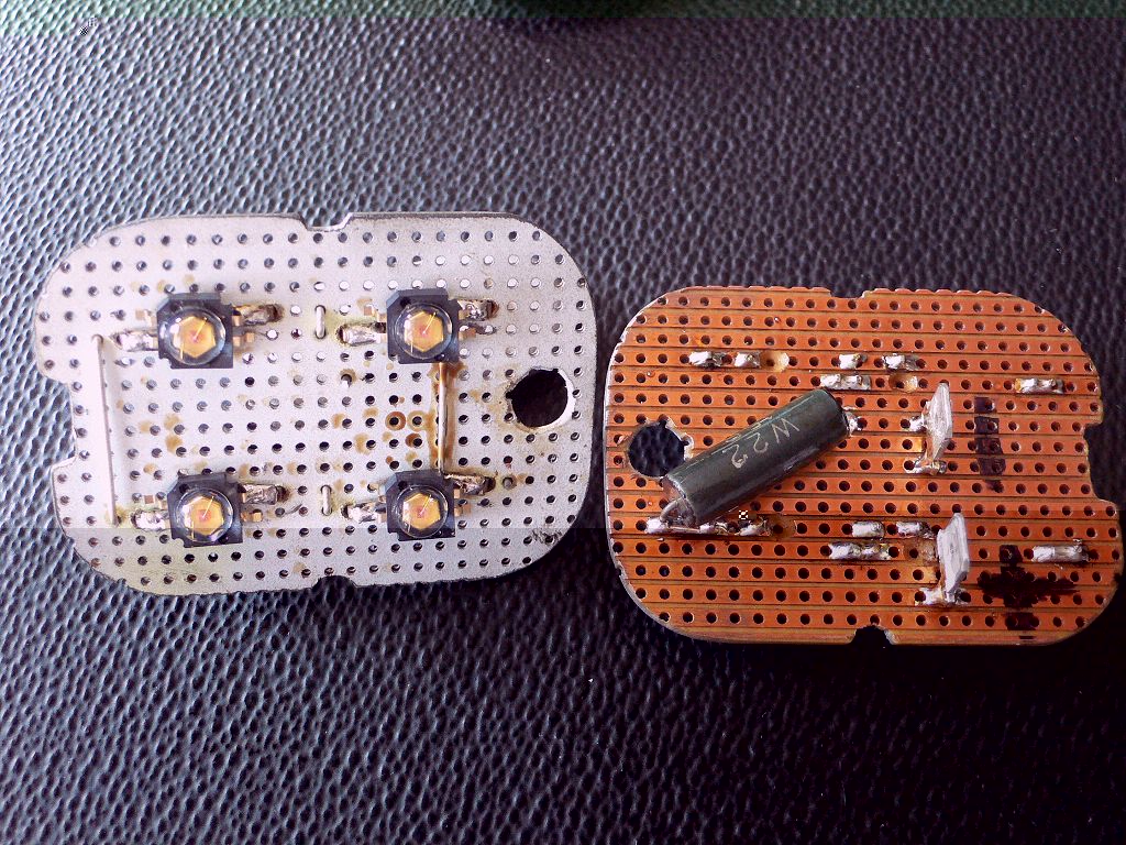 Kannst Du die Lochplatine nicht durch ein Alu-Formstück ersetzen? Ups, nicht einfach auszusaegen und bohren muss ich sie dann auch? Mit dem elektrischen Anschluss meine ich eigentlich Widerstände oder KSQ zur Stromkontrolle. Widerstand. Steht hier doch immer 33 Ohm min. 3,73 W bei 13 V. Wird wohl d...