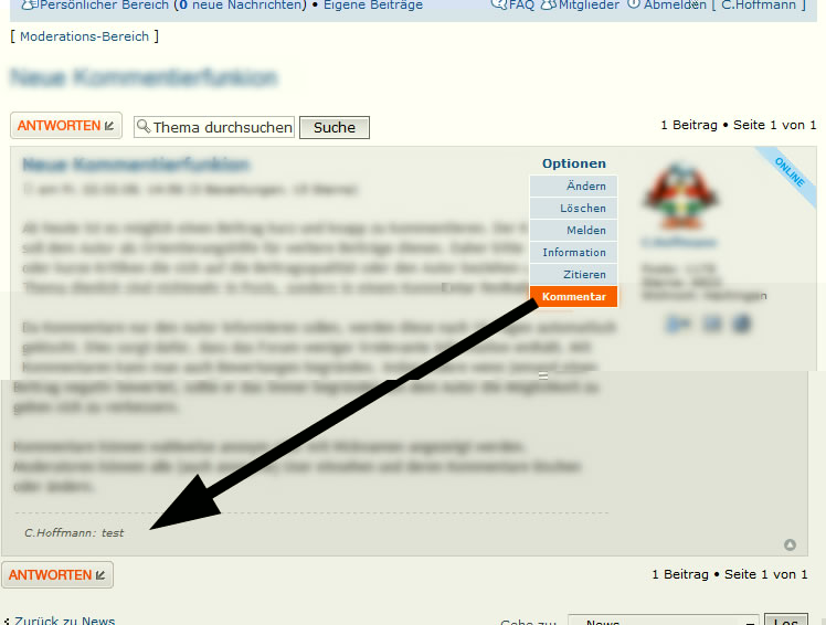 Die Kommentierfunktion ist zu finden im Beitrags-Optionsmenü (nur angemeldete User):