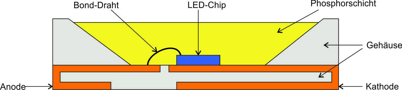 Die Sperrschichttemperatur kann nicht direkt gemessen werden, da sich der LED-Chip im Inneren des LED-Gehäuses befindet. Als Beispiel hier ein stilisiertes Schnittbild durch eine SMD-LED: