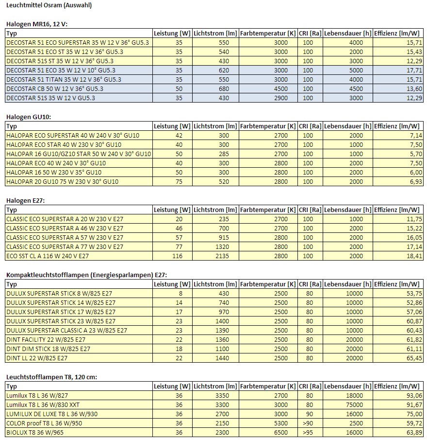 Die nachfolgende Tabelle hatte ich schon mal veröffentlicht, der Einfachheit halber hier nochmal: Alle Daten habe ich den Datenblättern auf der Internetseite von Osram entnommen.