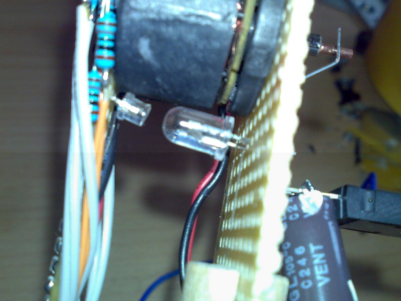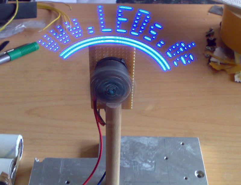 Der µC (Attiny2313) ist direkt auf die Motorglocke geklebt. Genau wie ein Stück Lochraster, wo die 14 blauen SMD LEDs aufgelötet sind. 180 ohm Widerstände verbinden beides fliegend. Hinten sitzt als Gegengewicht ein Low ESR 1500µF 6,3V Stützkondensator, falls mal ein Schleifer abhebt. Da der alleine aber nicht schwer genug war, kam noch eine M4 Mutter mit Bindedraht dazu: