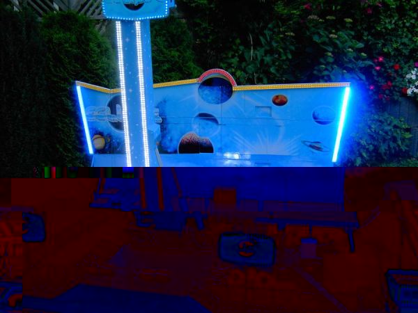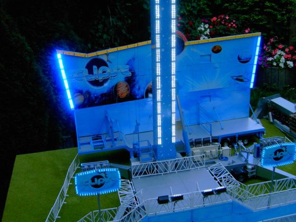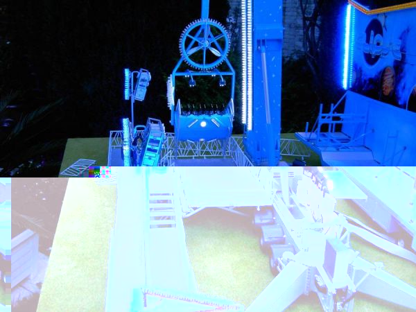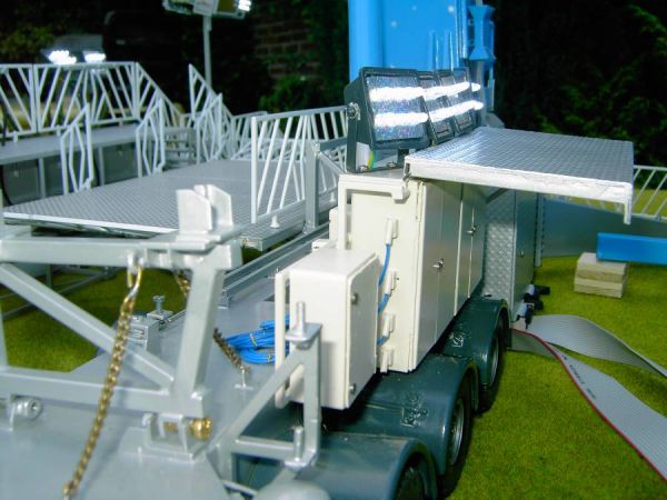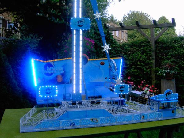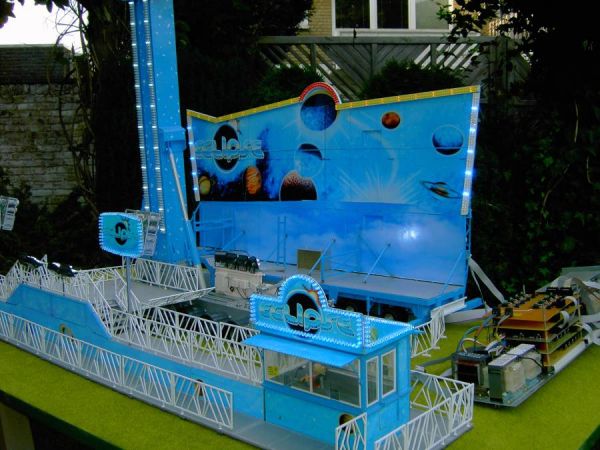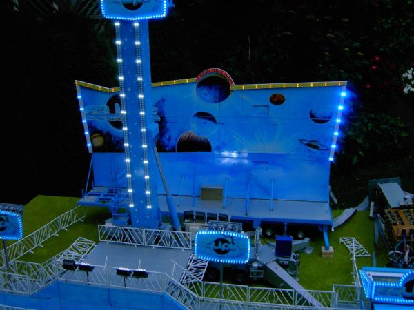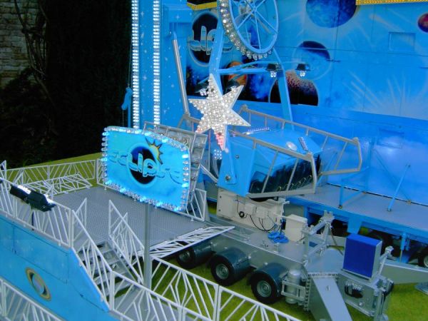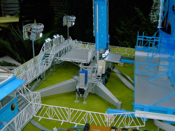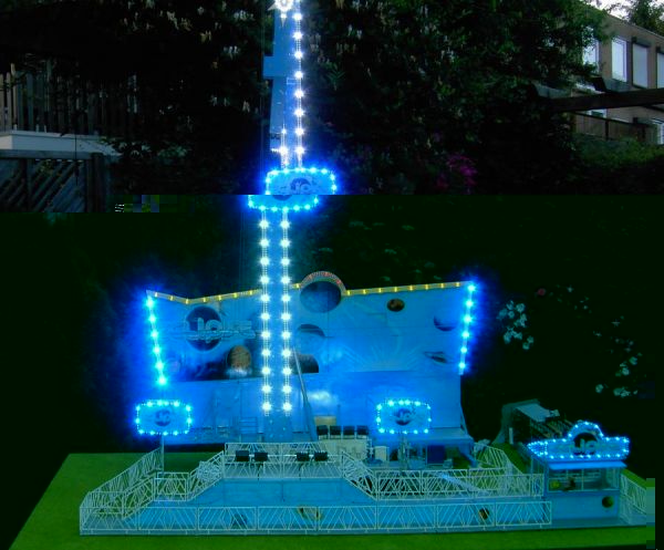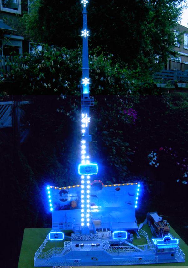 Ich würde ja ein Video mit meinem Fotoapparat machen wenn in einer Woche die Motorsteuerung fertig ist. Aber ich habe keine Ahnung wie das Video ins Forum gepostet wird. Schreibt mir mal ein paar Tips dann wird es schon klappen.Der Propeller ist auch am Originalgeschäft nur eine Atrappe. Er hat mit dem Antrieb nichts zu tun. Der Antrieb sitzt am Ende der Säule wo auch die Schleifringe für die Stromübertragung sitzen. Auf einem Bild kann man das sehen.Zur Zeit baue ich die Motorsteuerung und dann ist das Modell fertig. Das Modell ist sehr schwer weil am Ende des rotierenden Armes alles mit Blei als Kontergewicht gefüllt ist. Sonst würde sich der Arm niemals drehen. Am 6.7. in Düren ist das keine Modellbauausstellung. Dort im Stadtcenter habe ich dann meine komplette Kirmes aufgebaut. Die Ausstellung ist 21 Quatratmeter groß und wird über Schaltuhren gesteuert. Ich bin nur beim Auf und Abbau da.