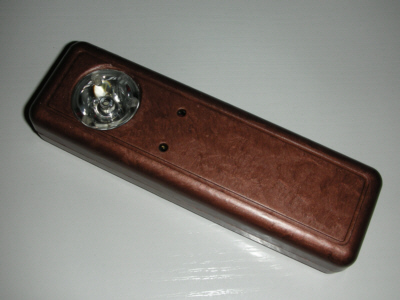 Hier die fertige Lampe. Die zwei kleinen Löcher im Gehäuse waren mal für zwei 3mm LEDs erforderlich, jetzt dienen sie halt als „Lüftung“.