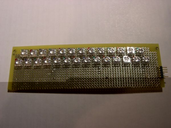 Hier habe ich die roten, grünen und blauen Superflux-LEDs verschachtelt auf eine halbe Europlatine mit Punktraster gelötet, jeweils 9 Stück pro Farbe: