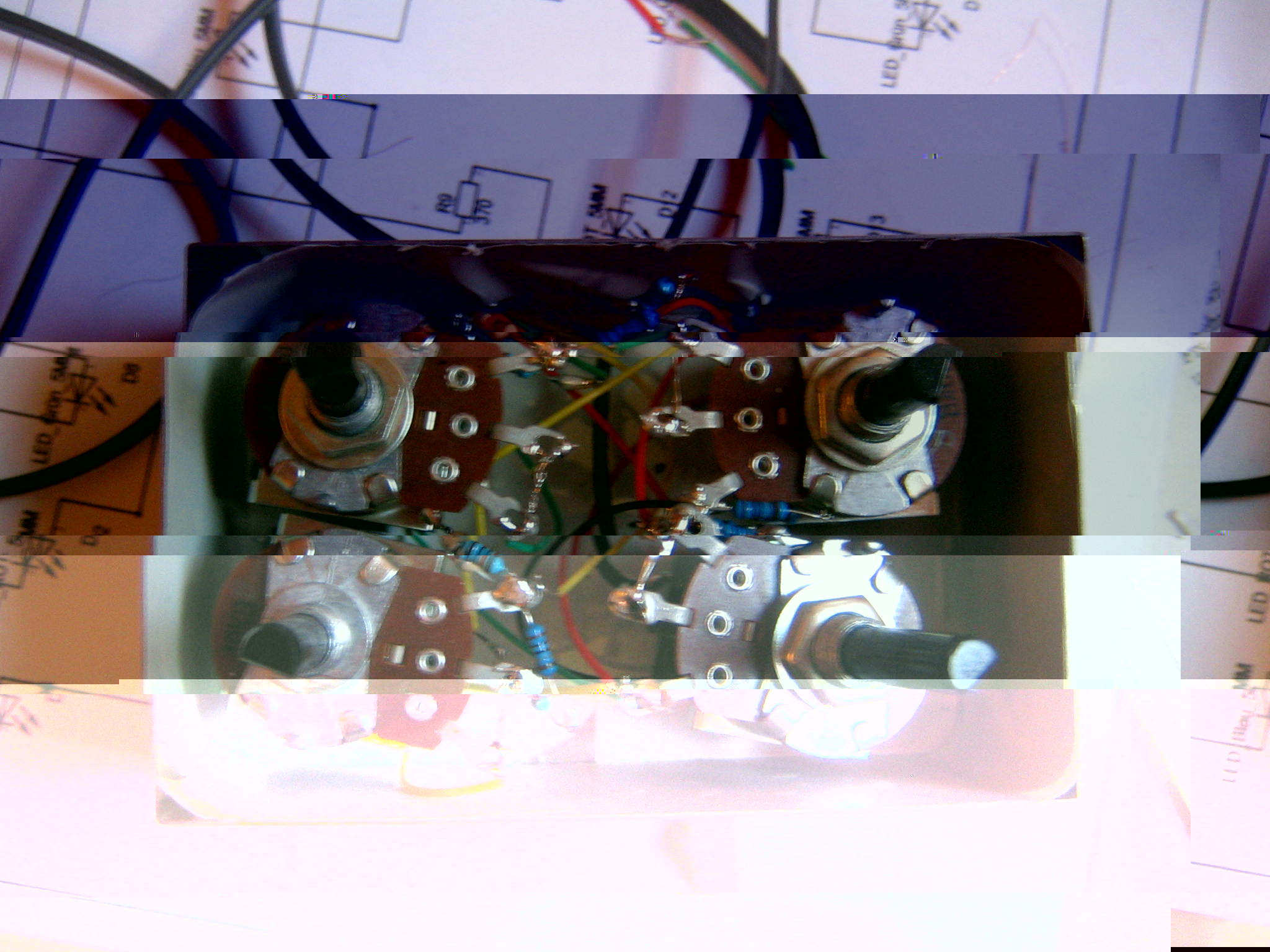 Dann haben wir jeweils einen Poti, der zu jeder einzelnen Farbe gehört und mit der wir das gleiche mit jeder Farbe machen können.