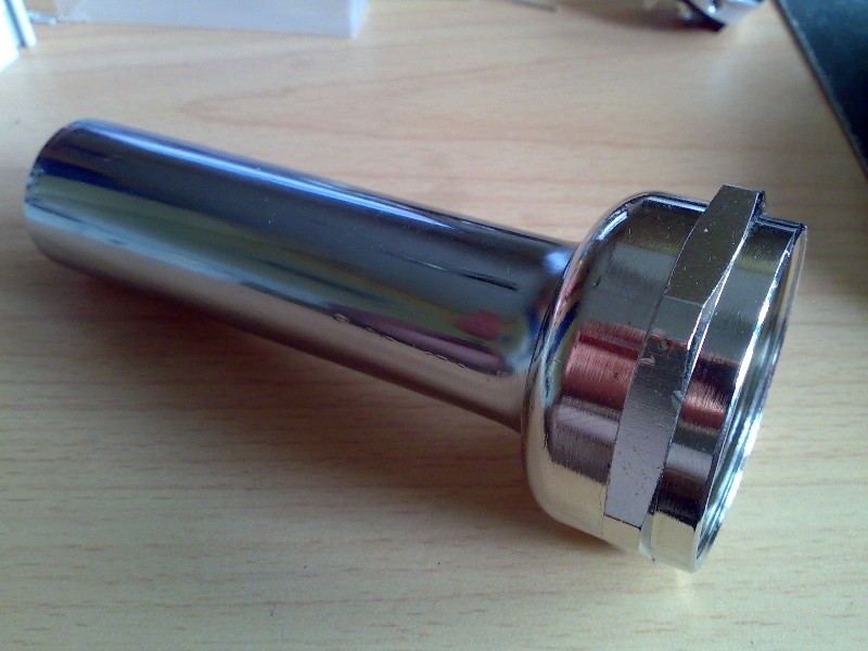 Hier erstmal ein Bild der beiden grundlegenen Teile der Taschenlampe. Sie sind bereits verlötet. Dazu wurde vorher das Chrom entfernt, dann verzinnt und zum Schluss mit dem Brenner zusammengeschmolzen. Scheint zu halten :wink: .