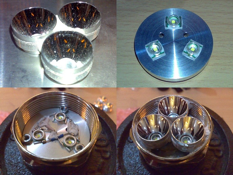 Nun gehts in die Endmontage. Die 3 Reflektoren wurden vorab schonmal mit Motagekleber in die passende Form gebracht. Die LEDs bekamen ihren Platz auf dem Drehteil, welches auch noch zwei Bohrungen für die Anschlusskabel erhielt. Der mittlere Teil ist durch die rückseitige Ausdrehung nur noch ca. 0,8mm stark. Ist aber nicht tragisch, da die LEDs weiter aussen sitzen. Die Ausdrehung war erforderlich, da direkt darunter die KSQ sitzt und die Speicherdrossel sonst keinen Platz gehabt hätte...