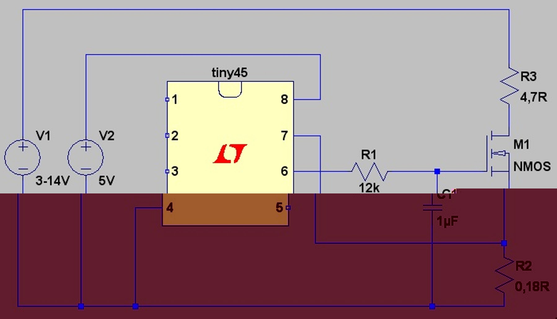 Was soll ich sagen. Nach 3mal Tiny flashen, weil ich zu faul zum genauen Rechnen war, hatte ich einen Strom, der bei 3-14V am Lastkreis und Verändern des LED-Ersatzes von 4,7-1,8 ohm nur zwischen 349mA-356mA geschwankt hat. Mehr, als ein paar Sekunden Laufzeit zum durchdrehen des Netzgerätes und überbrücken von Widerständen hab ich der Schaltung aber nicht gelassen, da der FET keine Kühlung hat.