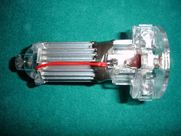 die original lampenhalterung wurde abgedremelt.. daran mit 2 komponentenkleber ein massiver alukühlkörker geklebt, dadrauf mit wärmeleitkleber die rebel, die auf einen str gelötet ist und dadrauf mit sekundenkleber die side emitting linse.. sieht gut aus..