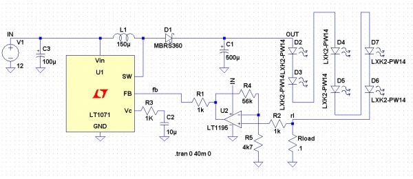 Dieser ist ein Step-Up Regler. Kann also auch ab Quellen mit niedriger Spannung Lasten mit höherer Spannung versorgen. Dies hat jedoch Einfluss auf den Wirkungsgrad! Wichtig ist dabei, dass ein schneller OPAMP zur Strommessung verwendet wird, da ansonsten das ganze ziemlich Schwinganfällig ist!