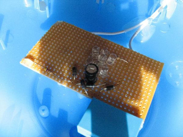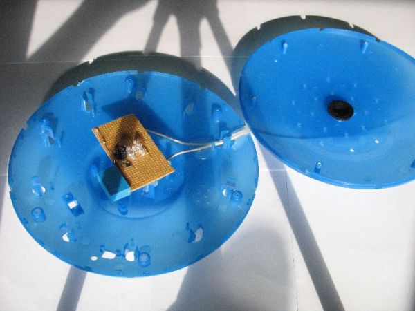 Die LEDs würden mitsamt der Schaltung auf eine kleine Platine gelötet und diese mittig in das geschlachtete "UFO" geklebt: