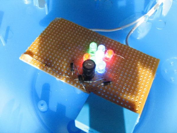 Mit verschiedenfarbigen LEDs leuchtet das UFO in allen Farben, macht keinen Laut mehr und der Stromverbrauch liegt bei deutlich unter einem Watt.