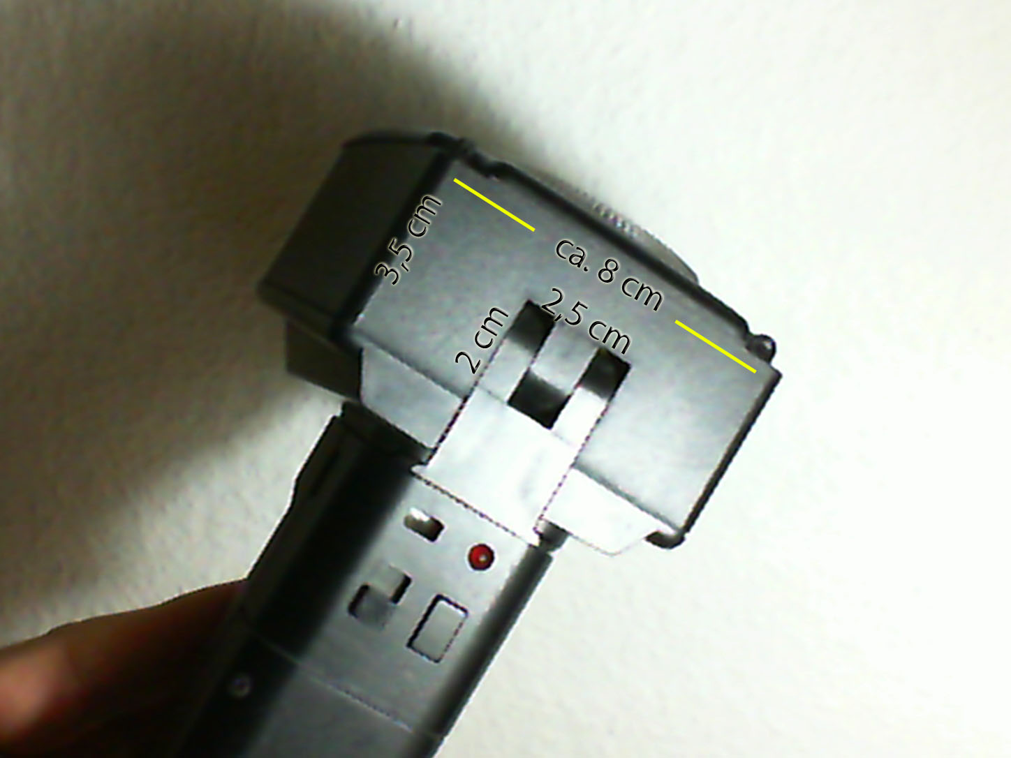 Hier wie versprochen Die Bilder mit den ungefähren Maßen. Man beachte die Aussparung an der Rückseite.