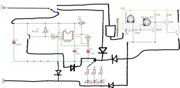 Ich weiss nicht so genau, ich finde eine kleine Skizze wäre von Vorteil. An sich hab ich meine Schaltung auch auf diese Weise geschalten. Was ich aber auf alle Fälle schonmal rate, ist die beiden Schaltungen, Strobo und Sound, getrennt voneinander aufzubauen und auch getrennt laufen zu lassen, also durch Dioden durch rückwertige Kriechströme oder der Gleichen zu schützen. Das werden dann aber einige Dioden werden, glaubt man garnicht, zumal ich auch die Masse getrennt hab.