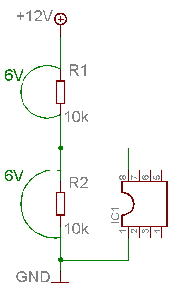 Hier mal ne schnelle Skizze zu Gedächtnissstütze. Eine Urspannung wird über zwei oder mehr Widerstände (reihenschaltung) in mehre Teilspannungen aufgeteilt. Die benötigte Teilspanung zum Betrieb von zum Beispiel einem IC wird dann paralell von dem jeweiligen widerstand "abgegriffen". Bei zwei gleichen Widerständen halbiert sich die Urspannung, an jedem WIderstand fallen nun 6 V ab, wenn die Urspannung 12 V beträgt. Ein IC wird meist mit 5V betrieben, wobei ich der Meinung bin 6 V sollten auch funktionieren, zumal ja der paralell geschaltete Kreis auch eine Impedanz darstellt, wodurch sich ja der Widerstandswert der Parallellschaltung von R2 verringert, was bedeutet das mehr Spannung über dem R1 abfällt und weniger über R2 und die Parallellschaltung.