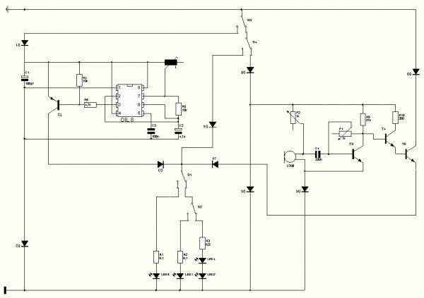 also zuerst der Stufenschalter, dahinter die Schaltungen, links strobo, vom T-strobo zum Stufenschalter, dazwischen ne diode. vom gnd-strobo zum gnd, dazwischen ne diode. in der mitte dauerlicht. vom Stufenschalter über diode direkt zum nächsten Schalter. Rechts, durch den ominösen Spannungsteiler in das Soundtolight. vom T-sound über ne diode zum Stufenschalter. Vom gnd-sound über ne diode zum gnd.