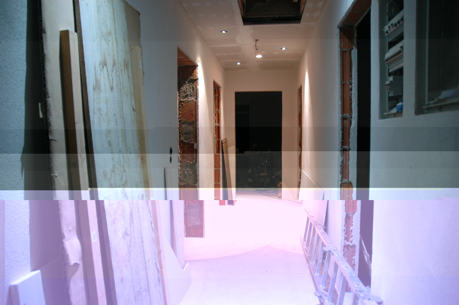 Nach Anfängen habe ich mal provisorisch ein paar Spots aufgehängt um zu sehen wie die wirken. Wie man auf dem Bild jetzt leider nicht so gut erkennen kann, ist es im oberen Bereich etwas zu dunkel, daher habe ich mir was überlegt, wie man den oberen Bereich etwas erhellen kann. Zuerst wollte ich Superfluxleisten hinzufügen, aber diese bündig in die Gipskartonplatten einzubauen war mir etwas zu zeitintensiv und langsam brennts mir unter den Fingernägeln das die Kinderzimmer/Räume fertig werden.