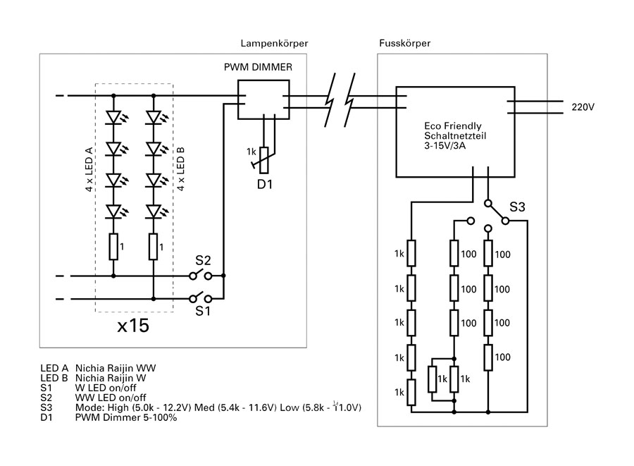 Im späteren Lampenkopf befindet sich dann der Dimmer und die beiden Schalter, mit denen man zwischen