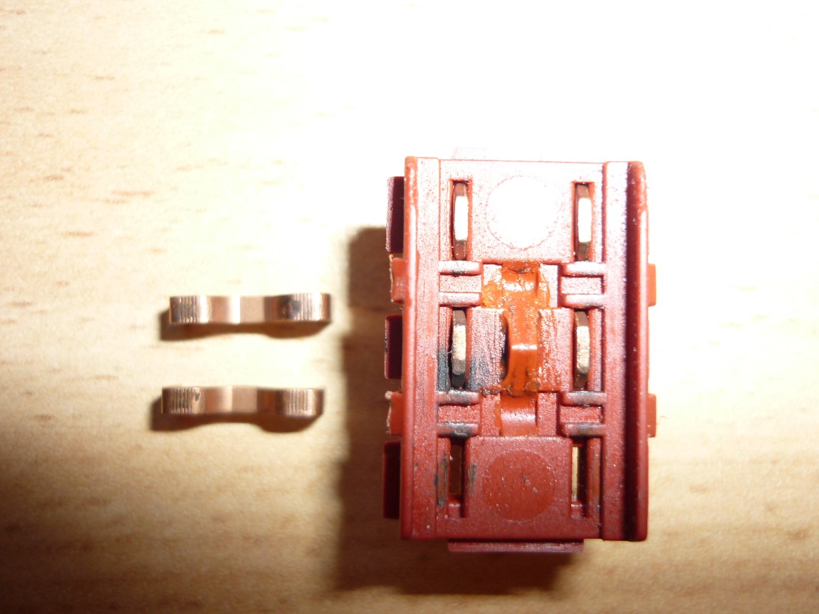 Dann der alte Schalter gereinigt und der erste gekaufte Schalter offen und mit den "Kupferschiebern".