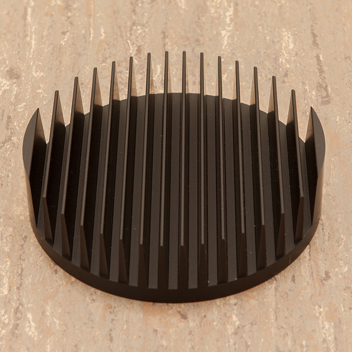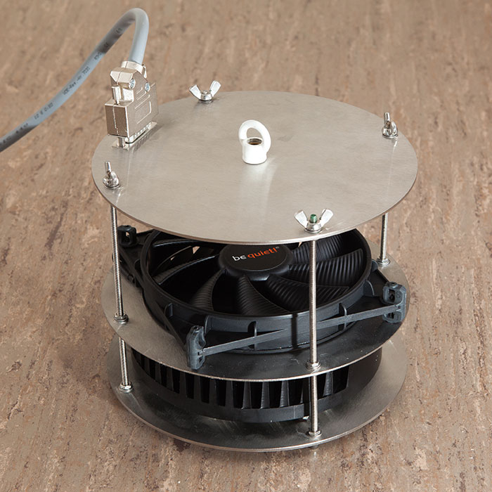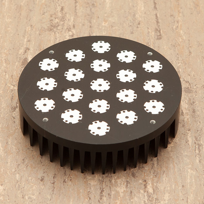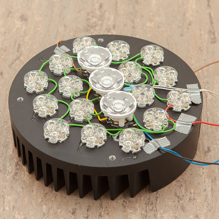 Was fällt auf? Genau: Die gebürsteten Seiten der Edelstahlscheiben zeigen nach oben, zur Decke, nicht nach unten, zum Betrachter. Warum? Weil ich nicht aufgepasst habe und die Schablone zur Ausrichtung der LEDs verkehrtherum auf den Kühlkörper gelegt habe. Was noch? Die M4-Gewindestangen sind arg, arg mickrig. Das ist zwar nur ein rein optisches Problem, das Teil ist bombenstabil, aber falls ich das Ding nochmal baue, dann mit M8-Stangen.