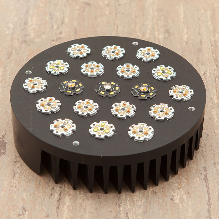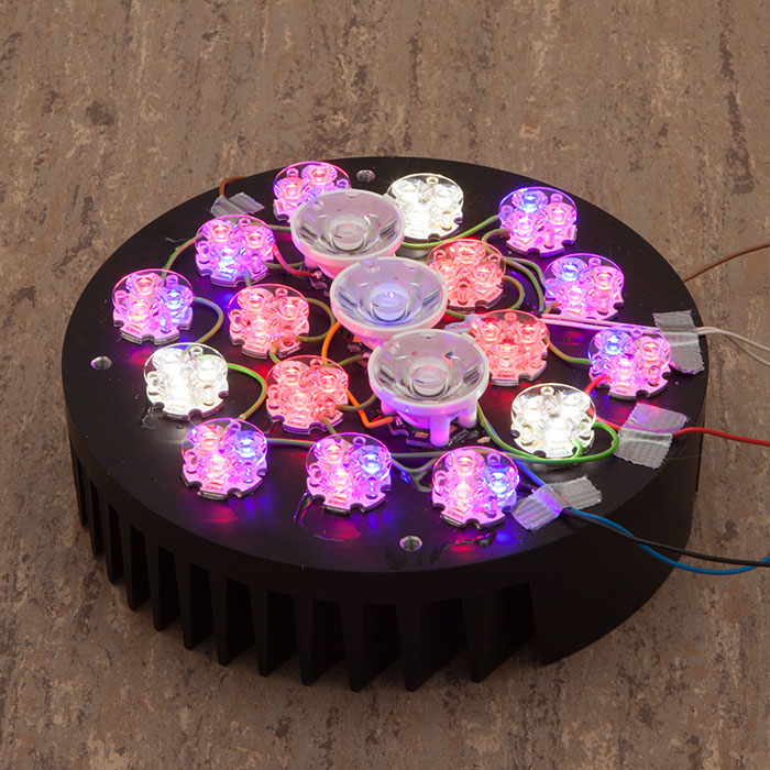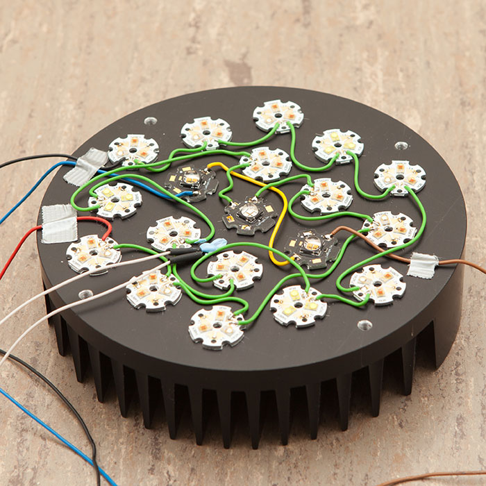 Alle mit 700 mA befeuert, macht das eine Gesamtleistungsaufnahme von etwa 100 Watt. Die Far-Red-LEDs laufen jedoch nicht ständig mit, sondern sind dazu da, das Tagesende zu simulieren, bzw. mit gezielter Nachtunterbrechung die Blütenbildung zu stimulieren.