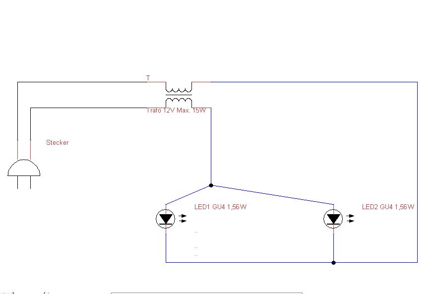 Bliebe noch zu erwähnen, dass der Trafo im Schaltplan fatal falsch eingezeichnet ist (so würden Primär- und Sekundärwicklung in Reihe zum Verbraucher geschaltet, eine galvanische Trennung wäre nicht vorhanden) und dass es keine GU4-LEDs gibt, sondern nur LED-Leuchtmittel mit GU4-Sockel.