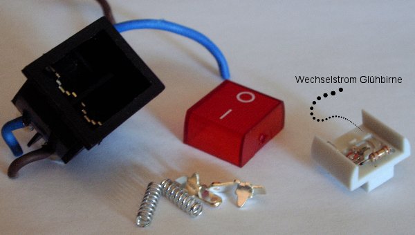 Da die Schalter aber nur unter 220V Wechselstrom leuchten, habe ich auch den Schalter zerlegt: Dann habe ich anstatt der Wechselstrom Glühbirne eine 5mm rote Led eingebaut.