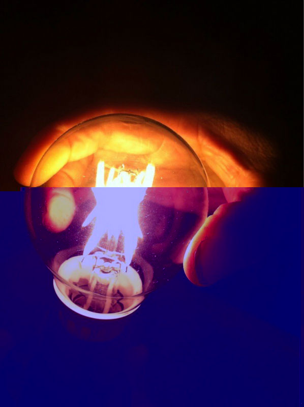 Ist Euch mal aufgefallen, dass der Halter für die Led-Fäden ebenfalls aus Glas ist. In der Mitte ist ein Rohr zu erkennen. Somit besteht die Möglichkeit, dass die Led-Fäden im luftleeren Raum oder unter Schutzgas betrieben werden.