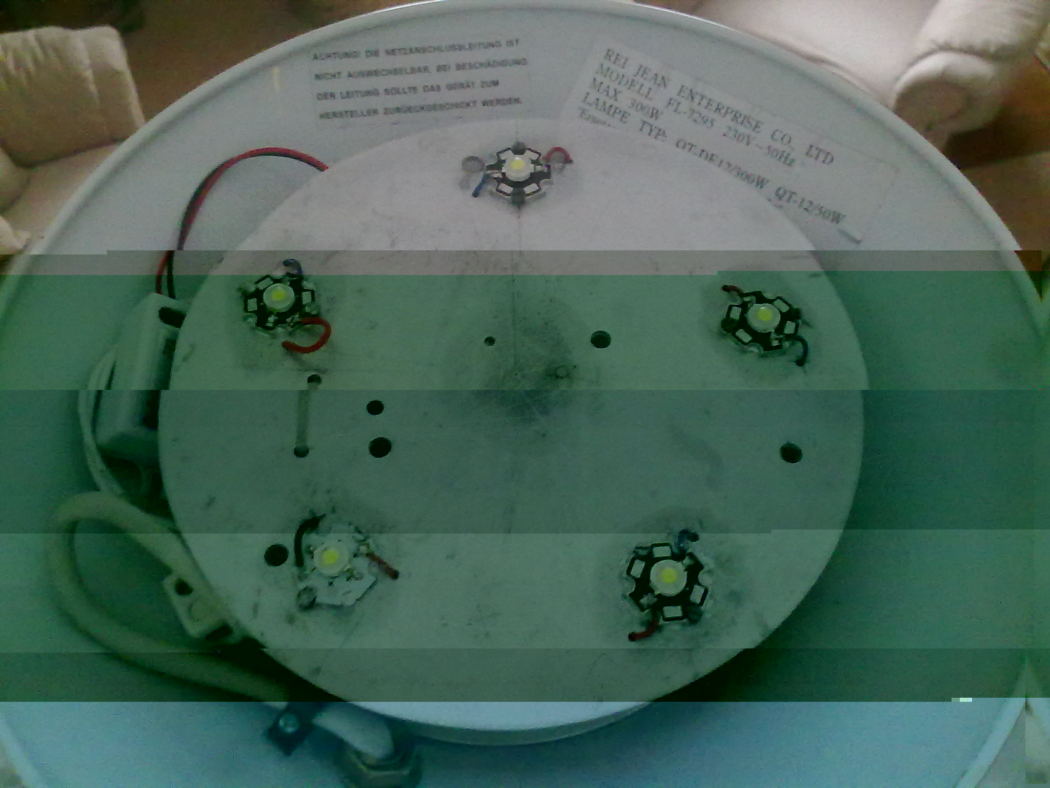 Ich habe meinen Deckenfluter umgebaut. Auf ein 1mm AluBlech 18 cm Durchmesser 5 Stck ! Watt Led :