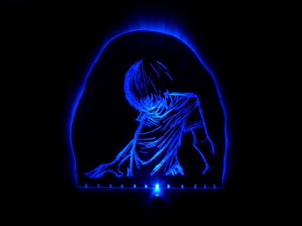 Ich zeig euch erst ma mein Walpaper. Das diente als Vorlage! Und das Ergebnis! Das war nur'n Test! Wie ihr sicher seht steckt da nur eine Led in der Bohrung. Wenn ich's hinbekomme soll da ne rgb Steuerung rein, deswegen sind da auch so viele Bohrungen drin!