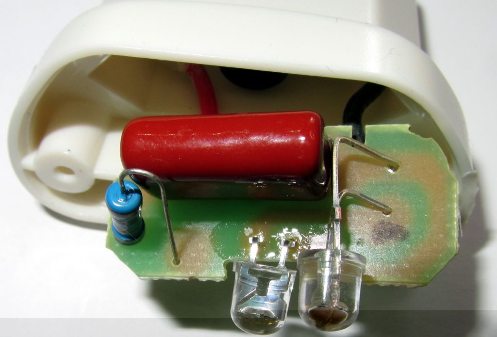 Bevor das Nachtlicht wieder zusammen geschraubt werden kann, muss aus dem mittleren Steg im Gehäuse ein Teil herausgebrochen werden, um für die zusätzliche LED Platz zu schaffen. Das geht recht einfach mit einem Seitenschneider. Auf Schönheit kommt es hier nicht an, nach dem Zusammenbau sieht man ohnehin nichts mehr davon. Ergebnis:
