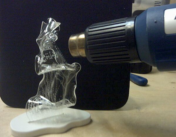 Bei den untersten Bildern hast du nen Loch in der Figur: Hast du das im Vorraus reingesägt, oder solange mit der Heißluftpistole draufgehalten, bis das Acryl verflossen ist?