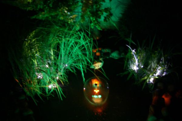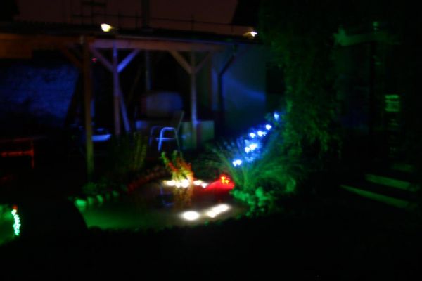 Hingegen sind die weißen Leds auf dem Teichboden angebracht und leuchten nach oben an die wasseroberfläche. Weitere weiße Leds wurden in Pflanzen versteckt um diese zu beleuchten.