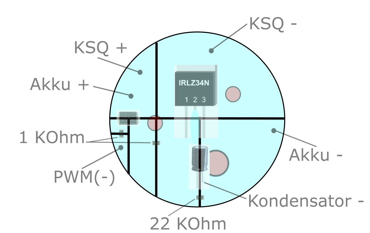 Die umrahmten Bereiche sind nicht Teil der Schaltung (statt zwei LEDs mit Vorwiderstand kommt ja eine Step-Up-KSQ zum Einsatz) und wie die PWM erzeugt wird wissen wir sowieso nicht. Relevant ist nur der PWM_Anschluss (='ein - Kabel geht gleich von der PWM an die KSQ'). Achtung: Der IRLU, 22K Widerstand und 1µF Kondensator gehen nicht an diesen Anschluss, sondern direkt an den Akku - Pol (da musst Du ein neues Kabel ziehen).