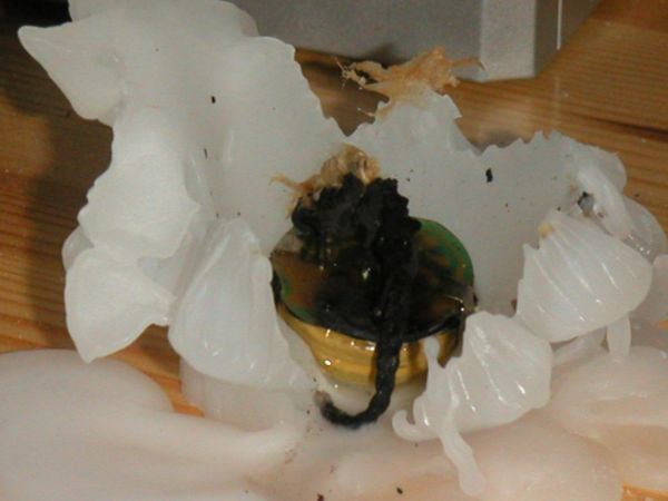 Naja das wachs ist halt hier schön verteilt und klebt an meinen Utensielien aufm Tisch. Klar wenn das gegen einen spritzt is natürlich ungut. Ach, ein Teil des Kondensators ist übrigens durchs ganze Zimmer geflogen. Hab ihn bisher noch nicht gefunden