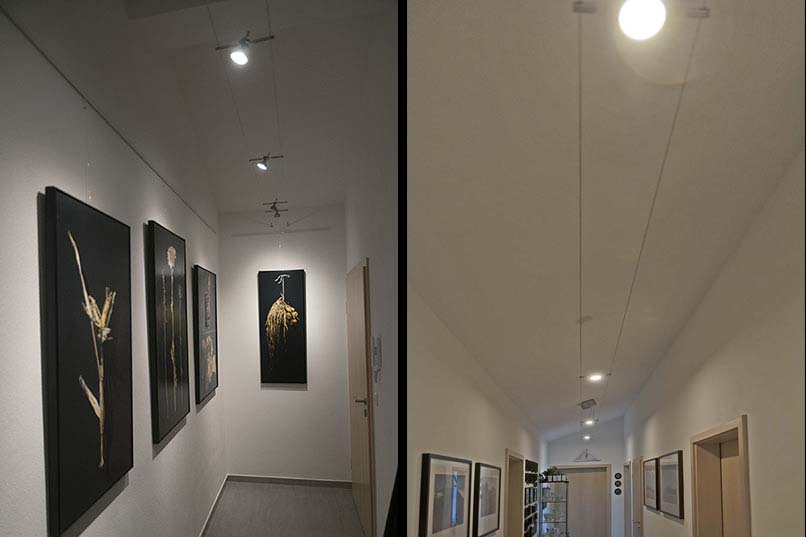 Mein Flur ist ein abgewinkelter - in Richtung des 2. Flurschenkels ist auch ein Seilsystem mit anderen LED-Leuchtentypen, die Kabel sind miteinander verbunden, Trafo in der Mitte der 2. Flurschenkel-Decke.