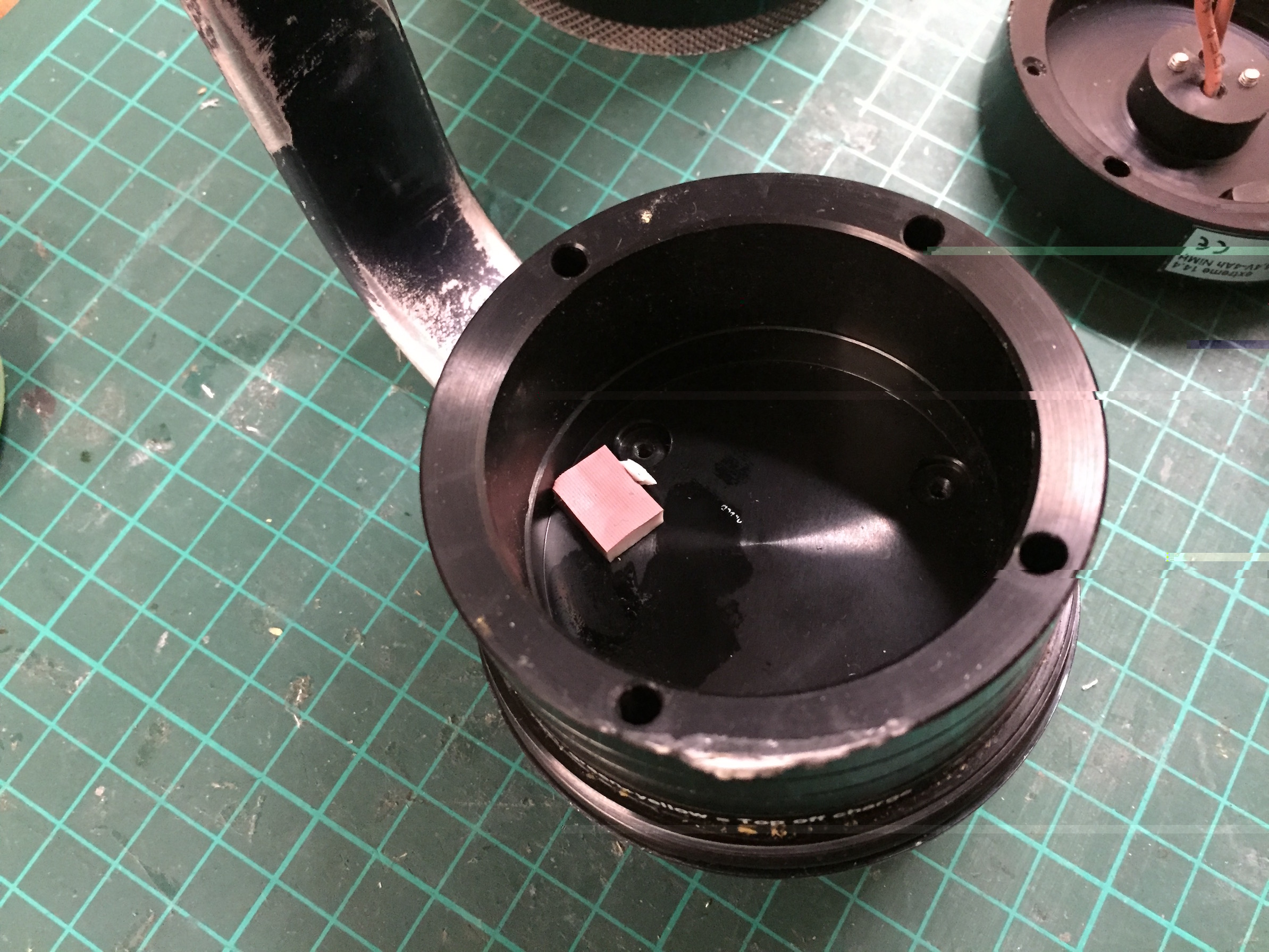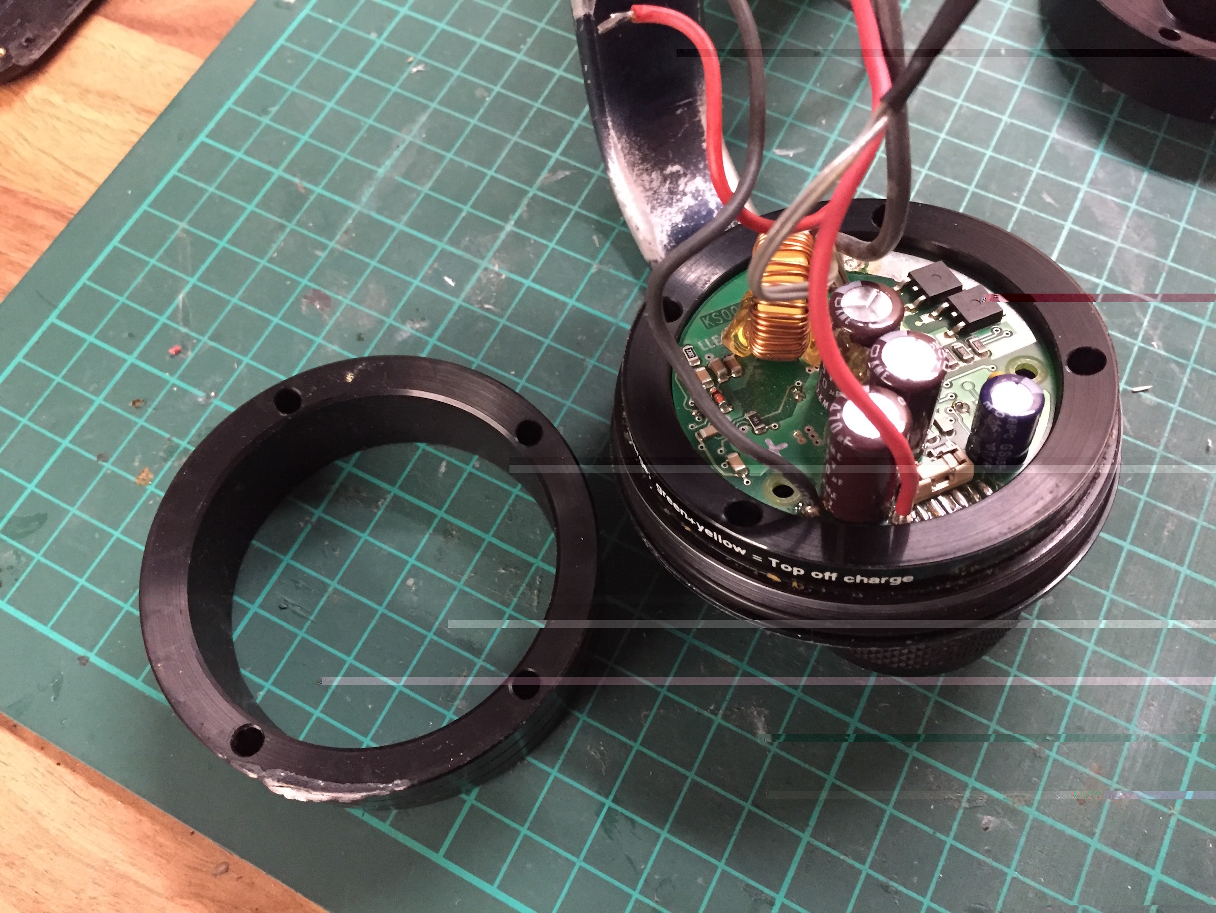 Also gehts ja jetzt schon fast ans eingemacht. Die Platine. Also an der Stelle wo eigentlich die Lade und Schaltelektronik sitzt, ist ein Alu Ring aufgesetzt. Nimmt man die Elektronik raus, habe ich da einen Raum von 29mm Höhe und ca 62,5 mm Durchmesser. Das wäre doch Wahrscheinlich mehr als Ausreichend, um da drin die neue PWM Platine und die KSQ unterzubringen ?! Oder sollte man die besser voneinander trennen. Wenn ja, wo könnte das das ganze aussehen und vor allem welche Teile brauche ich dafür. Das ist immer genau das, wo mein Latein aufhört *lach*. Zur Veranschaulichung ein paar Bilder im Anhang.