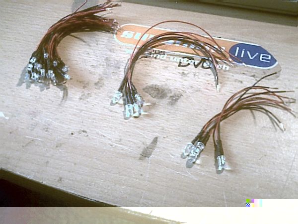 Auf jedenfall kommen insgesammt 24 Led's hinein, darunter 4x 5mm 15000mcd und 20x 3mm 15000mcd, und so habe ich dann auch heute mal schon alles vorbereitet, also Led's + Widerstand + Kabel und Schrumpfschlauch + verlizen der Kabel. So nun sah das ganze nach langer arbeit so aus...