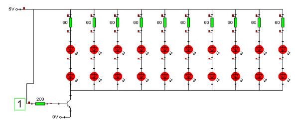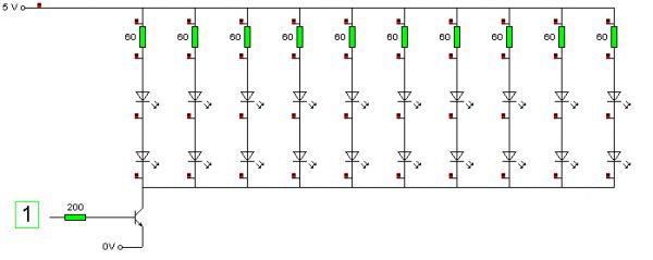 Jedenfalls sieht man ja, wie ich das meine, natürlich wird später dann so an die 10 diese 2er-LED-Cluster and einen "Masse"-Transistor gehängt. Das ist ja klar, sonst würde sich das kaum lohnen, habe das auch nur zum einfacheren Vorstellen so gemacht.