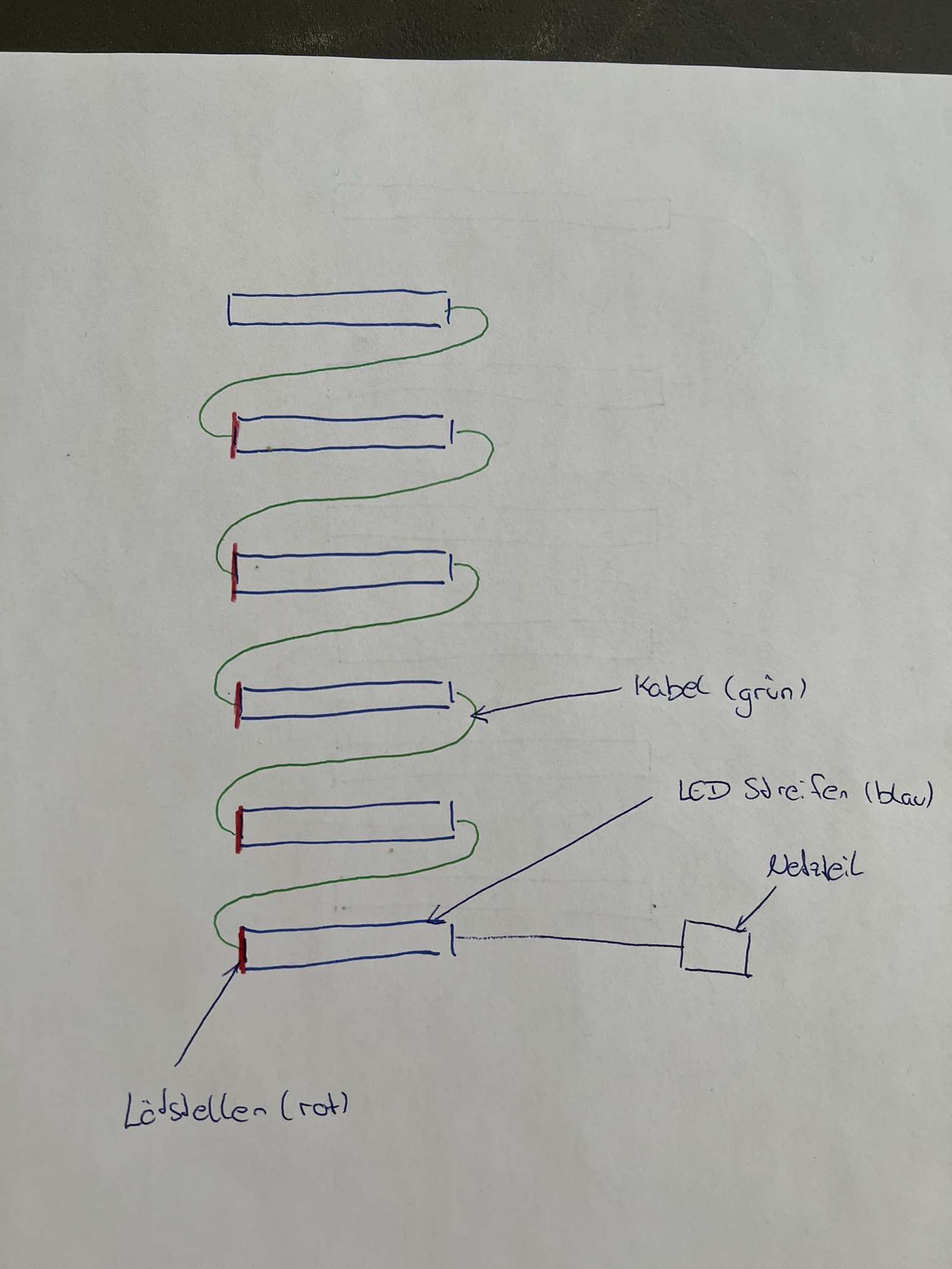 Ich habe Bilder beigefügt. Einmal von einem Brett damit ihr sieht wo je der LED Strip rein soll und einen Zettel wo ihr sieht wie das Ganze verbunden werden muss. Das Bild zeigt zeichnerisch das Regal von der Seite. Die Linien sollen die Kabel darstellen. Die Linie ganz links soll dann in einem Kabelkanal verschwinden.