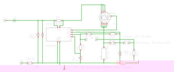 K1, K4-K8 sind Stiftleisten, wobei bei K1 Plus, K4 Masse, K5 LED -, K6 LED + und zwischen K7 & K8 wird ein 10kOhm Potentiometer reingehängt.