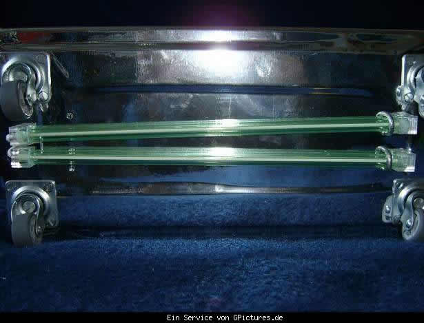 Der Unterboden wurde mit 4 Gummirollen versehen und mit Chromefolie beklebt,eine Grüne und Rote Unterbodenbeleuchtung mußte natürlich auch her.