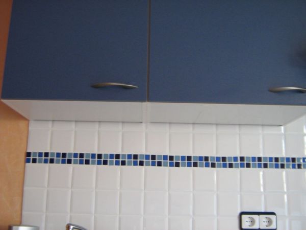 Zuerst habe ich das Aluprofil auf die benötigte Länge gekürzt. Ich habe es an jeder seite 5cm kürzer gelassen als die Schränke sind, damit man die Kante nicht direkt sieht. Nur am Kühlschrank liegt es direkt an. Danach die Schnittkante abrunden, sonst: Verletzungsgefahr!
