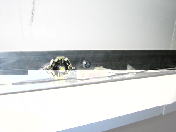 Die LEDs werden auf dem Aluprofil montiert. Dies hat den Vorteil, dass 1. dadurch eine mehr als ausreichende Wärmeableitung gewährleistet ist, und zweitens das L-Profil das Licht nach vorn abschattet, srich man wird nicht geblendet, wenn man sich z.b. leicht nach unten beugt.